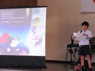 各学年ごとにこれまで学習したことを歌や劇、スライド、英語、群読など様々な手法を用いて発表しました。