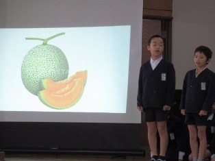3年生はこれまでに学習した、あいさつ、果物などの発表をしました。