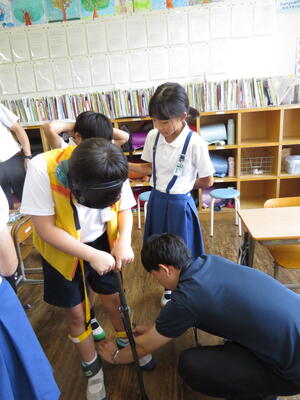 認知症がどのような病気なのかなどの基本的な知識を学ぶだけでなく、認知症が高齢者に多い病気ということで、おもりの入ったベストやイヤーマフなどを装着し、加齢に伴う体の機能の低下についても疑似体験して学びました。また、認知症の方への接し方についてクイズ形式で考えるなど、認知症について自分に関わりのあることとして考えるよい機会となりました。