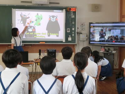 お互いの学校紹介や特産物、観光地などをこれまでに学習した英語表現を使って伝え合いました。