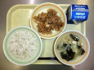 麦ごはん 牛乳 栄養満点みそ汁 豚肉とれんこんのぴりから炒め
