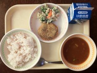 麦ごはん 牛乳 難関突破カレー(南関あげのカレー) メンチカツ 花野菜サラダ