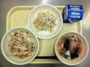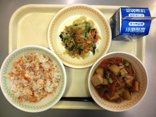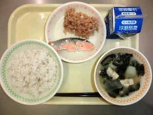 1月24日から30日までは全国学校給食週間です。みなさんが毎日食べている給食は、今から132年前、明治22年に山形県鶴岡町にある忠愛小学校で始まりました。学校にお弁当を持ってこられない子どもたちのために昼食を作って食べさせたのが始まりです。このときの献立は、「おにぎり・塩ざけ・菜の漬け物」でした。その後、戦争で給食が作られない時代もありました。その後、支援物資により給食が再開されました。そのことを記念して設けられたのが全国学校給食週間です。今日は、給食が始まったころの献立をイメージした給食をお届けします。