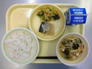 麦ごはん 牛乳 かしわ汁 さばの幽庵焼き いんげんのおかかあえ
