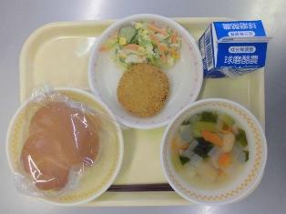 ひのくにパン 牛乳 大根とウィンナーのスープ 彩り野菜のメンチカツ コーンサラダ