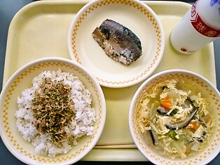 牛乳 麦ごはん かきたま汁 鯖のソース煮 てづくりふりかけ