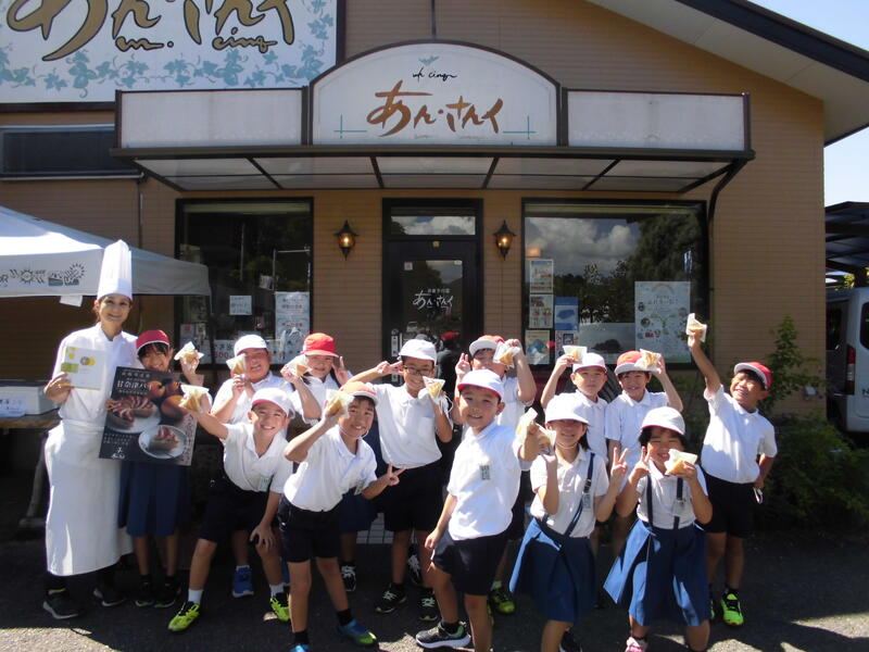 9月5日(金)に3年生が総合的な学習の時間に、地域の洋菓子店「お菓子の国 あん・さんく」に見学に行きました。津奈木町の特産品の一つである甘夏を使った「甘夏パイ」について、作り方だけでなく、津奈木町の食材にこだわって愛情をこめて作られているということを学ぶことができました。