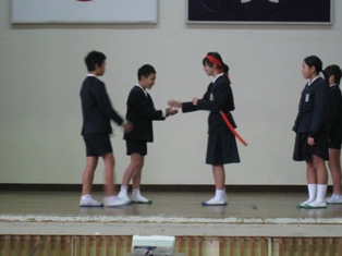 アダム先生のお話のあとは、一緒に英語の勉強をしている6年生が、自己紹介と「桃太郎」の英語劇を披露しました。