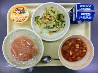 大豆は『畑の肉』と言われるように栄養価の優れた食品です。栄養たっぷりの大豆ですが、日本ではいつ頃から食べられるようになったと思いますか?原産地は、中国北部と言われ約4000年以上前から栽培されてきたそうです。日本へ伝えられた時期は、はっきりとしていませんが、縄文時代終わりから弥生時代のはじめ頃と言われています。日本の食文化を支えてきた大切な食品のひとつです。今日は、熊本県産の大豆をひき肉とトマトと一緒に煮込みました。よくかんで、食べましょう。