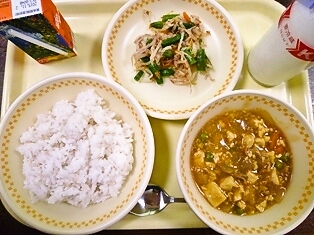 今日の給食は、カレー麻婆豆腐です。今日は、豆腐についてのクイズをしたいと思います。では、問題です。豆腐を初めにつくったのは、どこの国でしょうか? ①冷やっこが好きな日本 ②麻婆豆腐を作った中国 ③キムチ鍋によく使う韓国 答えは、②の中国です。今から2000年以上も前に中国で作られてきました。日本に伝わったのは、奈良時代で、江戸時代になって一般的に広まったそうです。今日の給食も残さず食べて、元気な体を作りましょう!