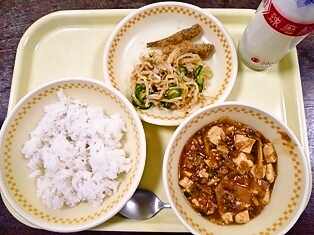 牛乳 麦ごはん 麻婆豆腐 いわしの梅の香揚げ もやしのキムチ和え