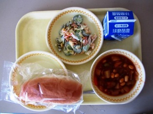 コッペパン 牛乳 チキンビーンズ マカロニサラダ