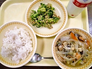 今日の給食は中華丼です。今日の中華丼には、キャベツ・にんじんなどの野菜や、イカ・エビなどの海の幸、しいたけやきくらげなどの山の幸がたくさん入っています。色々な食材が一緒に入ることによって、それぞれの食材がもっているうまみ成分が混ざり合い、料理がよりおいしくなります。栄養たっぷりの中華丼ですので、残さずに食べて下さいね!