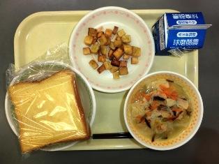 米粉入りかぼちゃパン 牛乳 ビーフンスープ キャラメルポテト