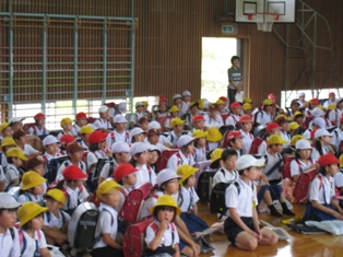 体育館に登校班ごとに集合し、大雨の時に注意することを聞きました。