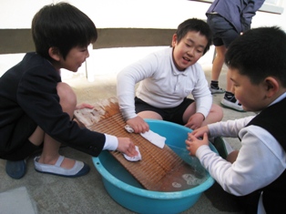 3年生が社会科の学習で洗濯板を使った洗濯を体験しました。