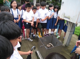 校内から地下水がくみ上げられていることにびっくりした4年生。