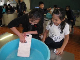 3年生が社会の学習で洗濯板を使った洗濯に挑戦しました。