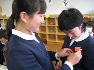 5年生にコサージュをつけてもらい、卒業式に臨む6年生。