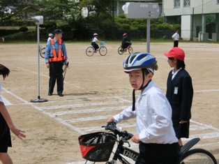 交通安全教室で、3年生以上は自転車の乗り方、1,2年生は歩行の仕方を学習しました。