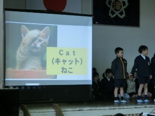 つなぎっ子集会で2年生が動物の名前を英語で発表しました。