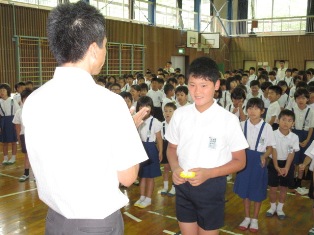 集会の時に話を聞く態度がよかったクラスを「聞き取り名人」として発表しています。