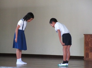 児童集会で生活委員会があいさつの仕方について発表しました。