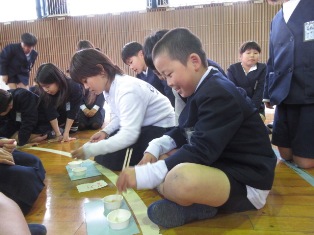 給食委員会の主催で豆つかみチャレンジが開催されました。