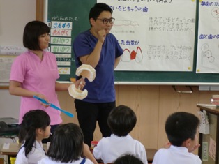 先週の中学年に続け、今度は低学年においてブラッシング指導がありました。