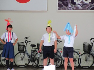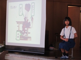 児童集会で学習委員会が授業中の姿勢や約束などについて説明しました。