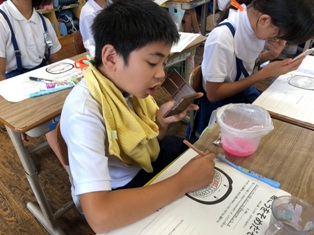 1年生と6年生が歯垢染め出し液を使ってブラッシングのチェックを行いました。
