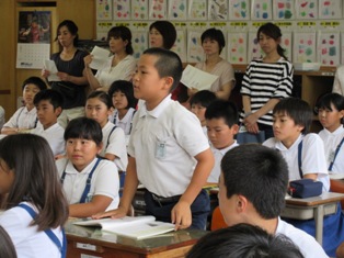 今回は全学年、「熊本の心」という資料を使って道徳の授業を行いました。
