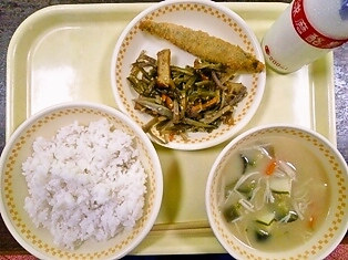 牛乳 麦ごはん なすのみそ汁 茎ワカメのきんぴら ししゃもフライ