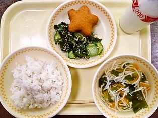 牛乳 麦ごはん 魚そうめん汁 星のコロッケ きゅうりの梅和え