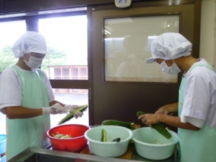 今日から、職場体験で中学生が2名給食センターに来ています!ゴーヤのたねを一生懸命とっています!