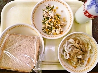 牛乳 黒糖パン ソーキそば ゴーヤチャンプルー