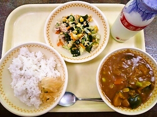 今日のカレーは、夏野菜カレーライスです。みなさん、今日のカレーには何の野菜が入っているか分かりますか?今日は、いつも入っているカレーの野菜に加えて、かぼちゃ・なす・えだまめなどの夏野菜が入っています。かぼちゃは、みなさんの住んでいる津奈木町で作られた物です。旬の野菜を味わって食べて下さいね!