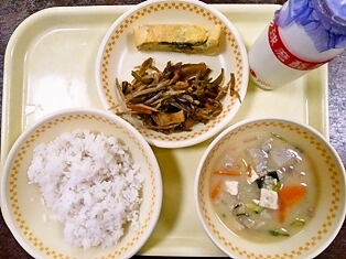 牛乳 麦ごはん 豚汁 茎ワカメのきんぴら 五目厚焼き玉子
