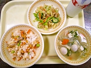牛乳 豚キムチャーハン 中華五目スープ 切り干し大根のサラダ