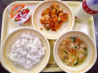 牛乳 麦ごはん スーミータン えびのチリソース煮 アセロラゼリー