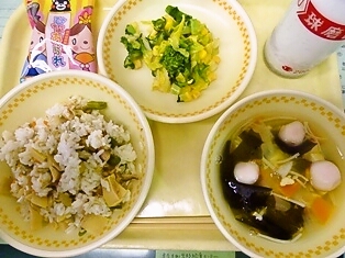 牛乳 たけのこご飯 すまし汁 菜の花サラダ ひなあられ