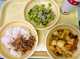 今日の給食のチキンビーンズに使っている豆は大豆です。昔の日本人は長い間、肉を食べる習慣がなく、代わりに魚や大豆を食べていました。大豆は、今から約2千年前に日本に伝わってきました。大豆には、骨や歯を強くするカルシウムや疲れをとるビタミンB1などもたくさん含まれています。また、大豆にはガンを防ぐ効果もあると言われています。栄養たっぷりの食材ですので、普段の食事にもぜひ取り入れて見てください。