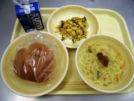 献立:米粉パン 牛乳 ソーキそば ゴーヤチャンプル