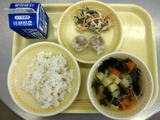 献立名:麦ご飯 牛乳 すまし汁 チキン焼売 ごぼうサラダ