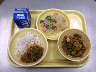 献立名:麦ご飯 牛乳 筑前煮 春雨サラダ 手作りふりかけ