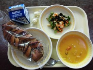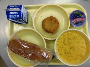 献立名:げんまいパン 牛乳 キャロットポタージュ かぼちゃクノーデル ブルーベリーゼリー
