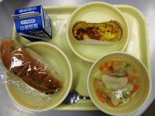 献立名:レーズンパン 牛乳 ラビオリスープ チーズ入り卵焼き