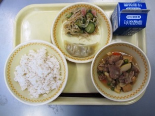 麦ごはん 牛乳 ヤージャン豆腐 ぎょうざ もやしのナムル