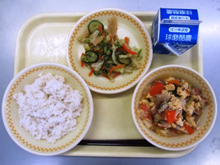 チンジャオロースは、中華料理のひとつです。「チンジャオ」とはピーマン、「ロー」は肉、「スー」は糸のようなという意味です。細く切ったピーマン、たけのこと豚肉を炒め、しょうゆとさとうで味をつけました。今日のチンジャオロースには、こんにゃくや熊本県産のたけのこが入っています。よくかんで食べましょう。