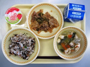 ひじきごはん 牛乳 チンゲンサイのスープ こんにゃく入りチンジャオロース ゆうべにムース